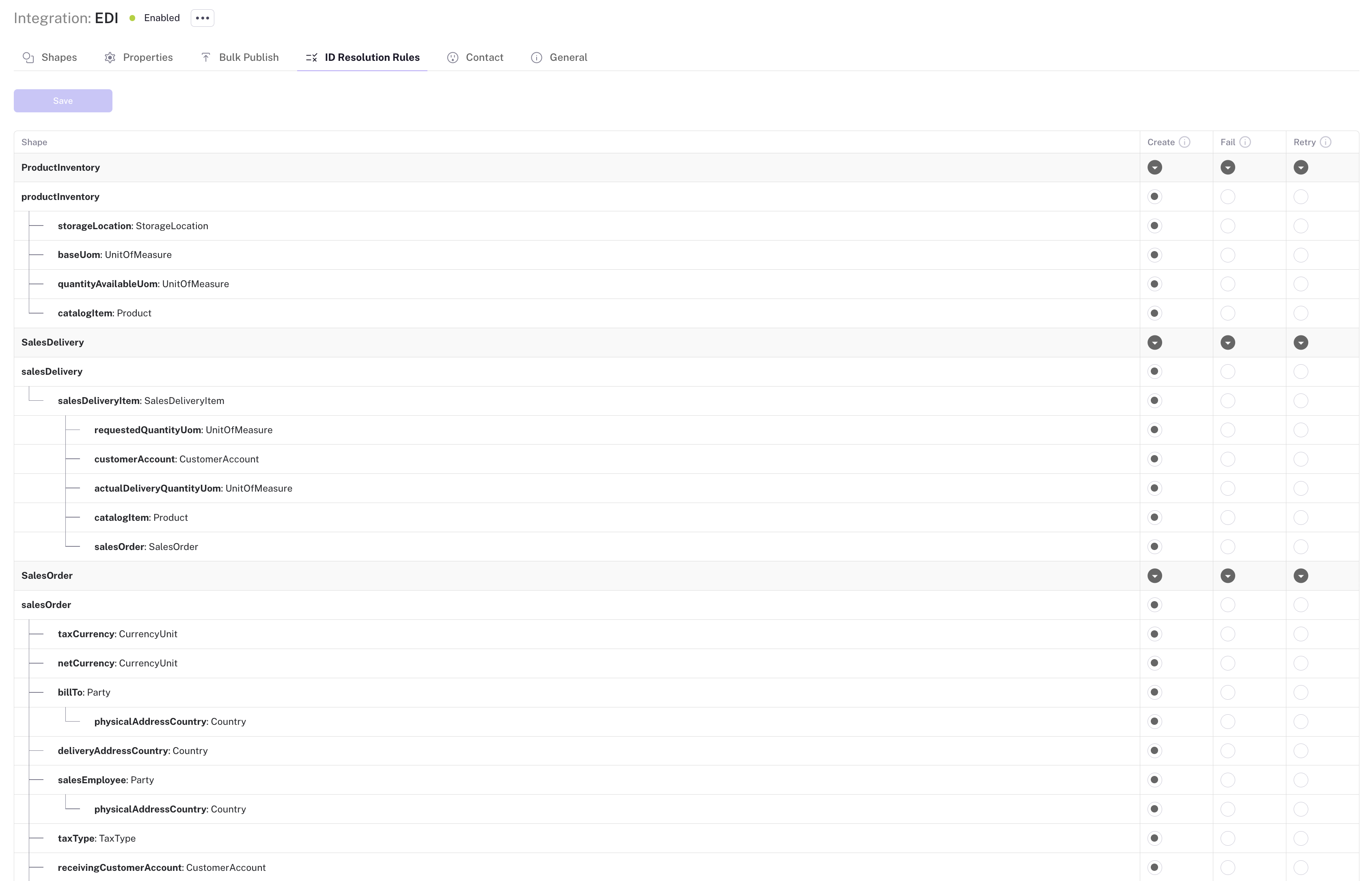 In the Integrations section, the ID Resolution Rules sub-page displays the data model structure with shapes and their nested sub-sections. For each component, you can configure the behaviour when an ID cannot be resolved: Create, Fail, or Retry. Seeing the model in this structured view helps you understand the complexity of your data and decide, property by property, which resolution rule is most appropriate.
